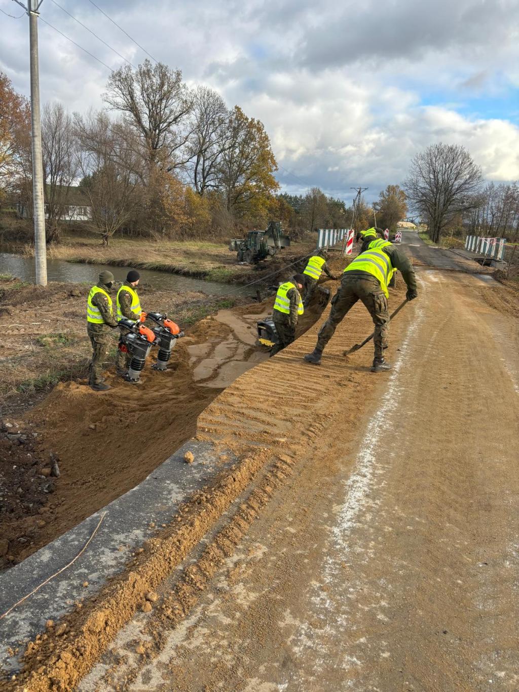 Z pomocą ciężkiego sprzętu inżynieryjnego, takiego jak koparko-ładowarki, wywrotki, dźwigi oraz specjalistyczne pojazdy SŁ 34, saperzy przystąpili do odbudowy zniszczonej drogi i mostu w miejscowości Drogoszów. Początki prac nie należały do najłatwiejszych, ponieważ teren wymagał gruntownego oczyszczenia, ponownego usypania oraz utwardzenia.